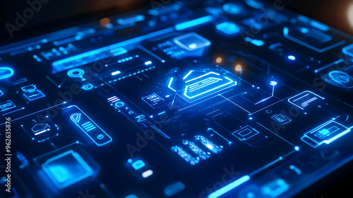 Abstract 3D Futuristic Interface with Blue Glowing Lines and Icons