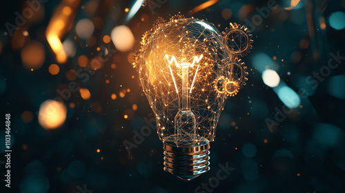 Abstract 3d light bulb with gears inside. Innovation, creativity, business technology idea concept isolated in white. Low poly hand drawing with lines, dots and shapes. Digital vector illustration