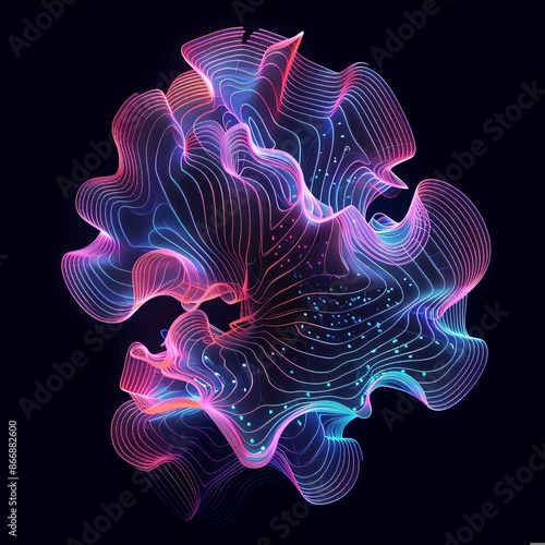 Abstract 3D render of swirling lines and particles, resembling a futuristic flower, brain or coral. Concept of technology, science, data visualization, and AI.