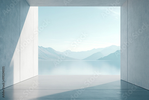 Abstract 3D rendering of minimalist style architectural space scene, mountain and lakeside building