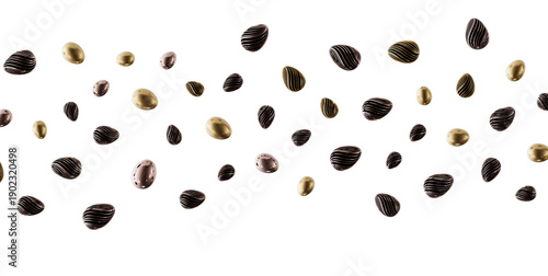 Abstract and elegant flowing egg-shaped forms in gold, bronze and textured black against a clean white backdrop. Perfect