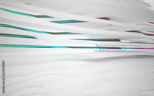 abstract architectural interior with white sculpture and geometric gradient glass lines. 3D illustration and rendering