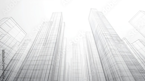 Abstract Architectural Wireframe Cityscape of Modern Skyscrapers on White Background