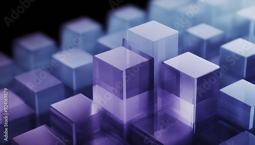 Abstract art of 3D render geometric transparent translucent future dusk, blue, purple, indigo cubes blocks, clear volumetric square shapes placed and piled up on dark black background.