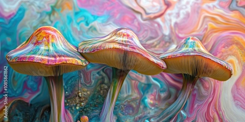 Abstract art of mushrooms with swirling paint effects and vibrant colors,