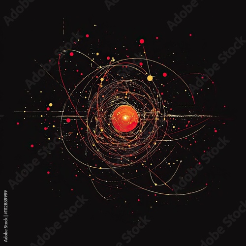 Abstract art; red, gold; swirling orbits; dark background.