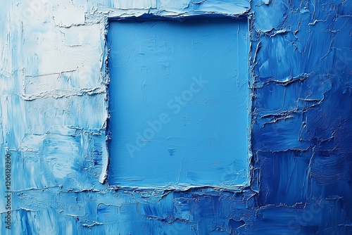 Abstract artwork featuring a textured blue background with a central square cutout.