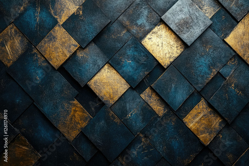 Abstract background of overlapping dark blue and gold squares with a textured surface.