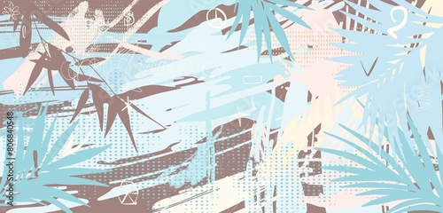 Abstract background with elements of tropical plants in mixed media (acrylic, pen, gouache) in pastel colors. Ideal for branding, website creation, printing, photo wallpaper and textiles, scrapbooking