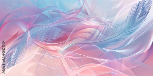 Abstract background with feathers and wavy lines in light pink and blue tones, smooth shapes, minimalist design, soft colors.