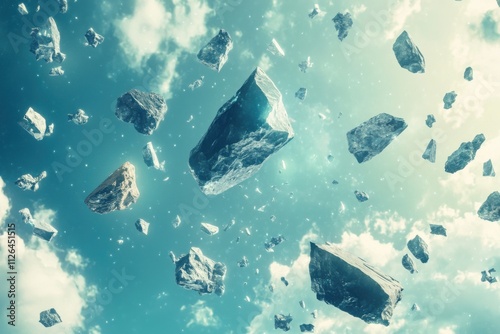 Abstract background with floating stone fragments in a bright sky, ideal for dynamic and creative designs