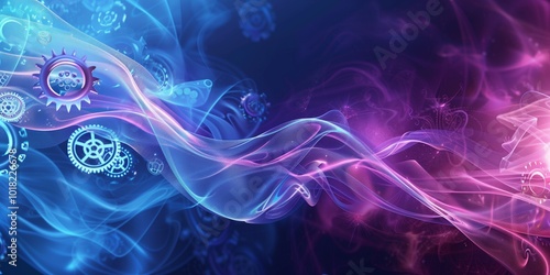 Abstract background with gears and deep blue and purple tones, smooth, bright hues, flowing lines, digital style, empty space.