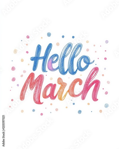 Abstract background with watercolor colorful splashes and dots decorations. Hello March - modern calligraphy lettering. Spring concept background.