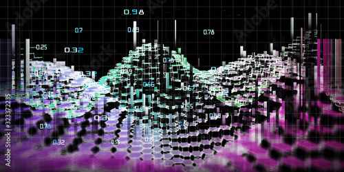 Abstract binary hexagon color wave. 3D big data concept. Intricate mass financial data threads analysis. Big Data. Business and finance analytics representation.