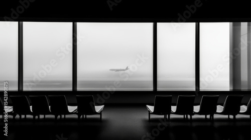 Abstract black and white airport terminal with waiting chairs. Airplane lands through foggy window.