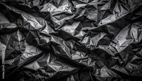 Abstract Black Crumpled Foil Texture Background with Dramatic Lighting.