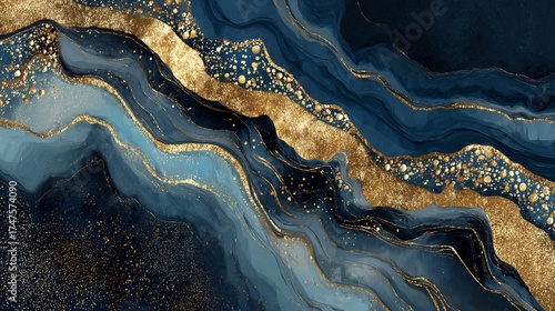 Abstract blue and gold fluid art background with glittering texture, elegant golden lines, and liquid ink waves.