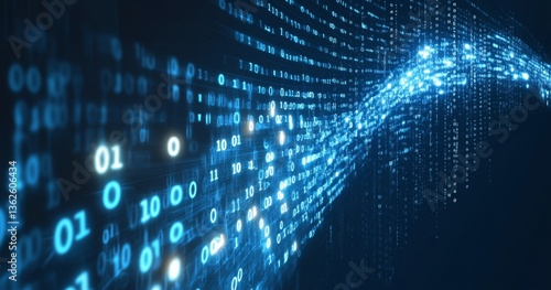 Abstract blue background with glowing lines and binary code in the shape of an electric cable or tube flowing from left to right, representing data transfer technology