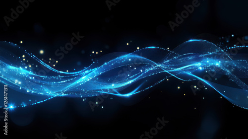 Abstract blue glowing particles wave on a dark background with a bokeh effect