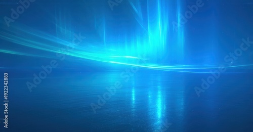 Abstract blue light streaks over water. Brightness creates horizon glow, evoking calm, serene atmosphere. Minimalist design.