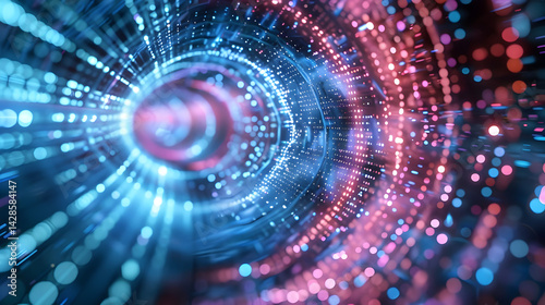 Abstract blue light tunnel with geometric patterns and glowing center point perspective view