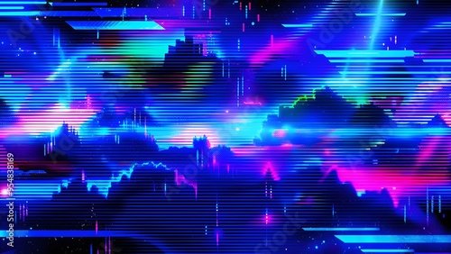 Abstract blue, mint, and pink background with interlaced digital glitch and distortion effect. Futuristic cyberpunk design. Retro futurism, webpunk