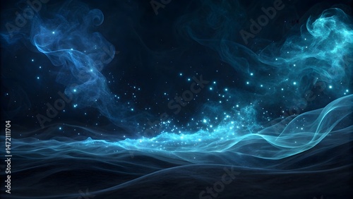 Abstract blue nebula with glowing particles and wavy forms against dark backdrop