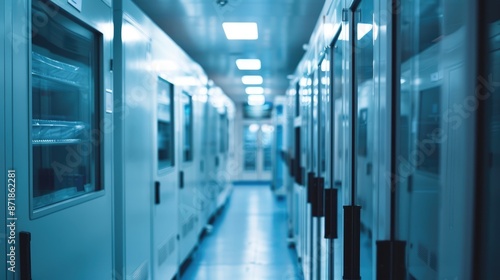 Abstract blur of 70 degrees freezer for specimen storage in hospital Rows of fridges storing blood for research at university