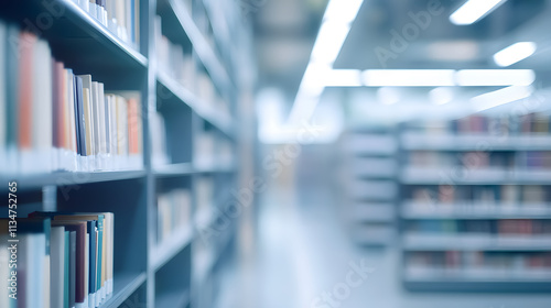 Abstract blurred interior of a public library, with defocused bookshelves for a business or educational backdrop
