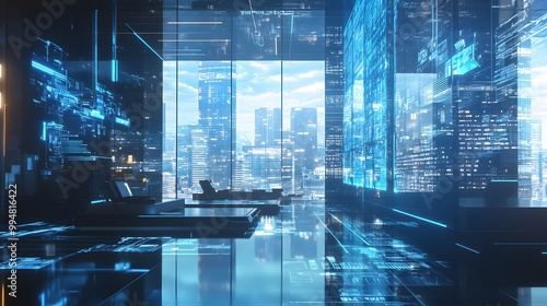 abstract business interior background, blue window double exposure, technology.