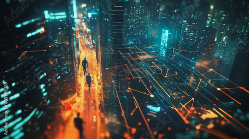Abstract business team stands on the peak of success amid tall, innovative Smart city and graphs with statistics to analyze business potential and predict future developments in company growth.