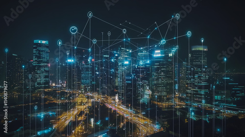 Abstract businessman stands on the peak of success Smart digital city with connection cyber security network reciprocity over the cityscape future wireless digital city and social media networking