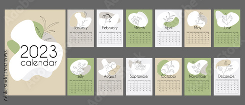Abstract calendar for 2023 in vertical A4 format.12 months and cover. Calendar in neutral natural colors with abstract spots and linear floral elements. With place for notes. Week strats on Sunday.