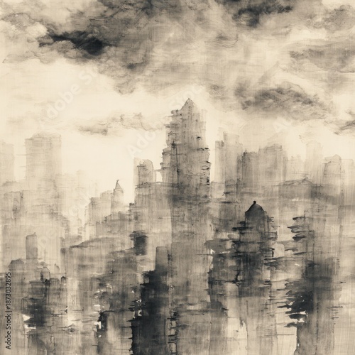 Abstract cityscape illustration with monochrome tones and atmospheric elements