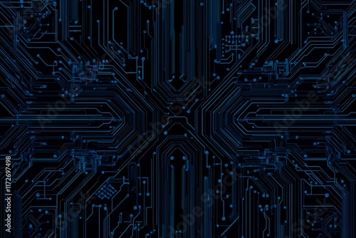 Abstract close-up of a glowing blue digital circuit board, showcasing intricate connections and technological design on a black background.