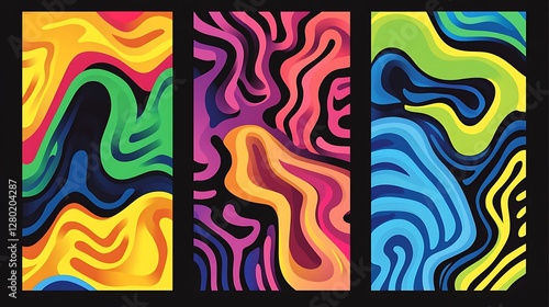 Abstract colorful fluid dynamic patterns, multiple sections, background, graphic design, mobile wallpaper