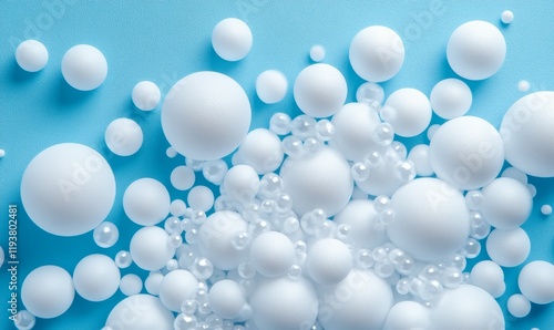 Abstract composition of white styrofoam balls, plastic beads, polystyrene balls, foam beads, foam craft, creative concept