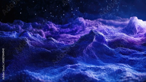 Abstract cosmic landscape with purple and blue nebula-like mountains under starry night sky.