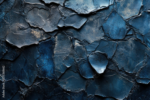 Abstract dark blue cracked texture, resembling a broken, metallic surface with deep shadows and uneven crevices.