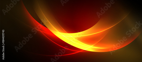 Abstract design features vibrant orange, red curves against dark background. Smooth gradients create dynamic, flowing visual effect.