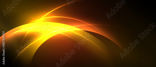 Abstract design features vibrant orange, yellow curves against dark background. Light radiates, creating dynamic visual effect.
