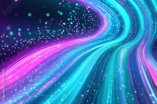 Abstract digital art of glowing neon light trails in vivid pink and blue hues with sparkling particles.