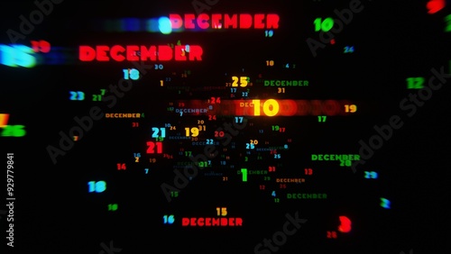 Abstract digital art with glowing text representing the month of December in festive neon colors on a dark background