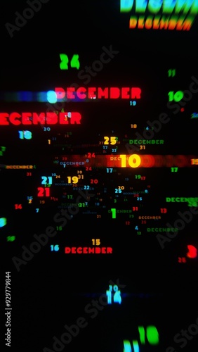 Abstract digital art with glowing text representing the month of December in festive neon colors on a dark background