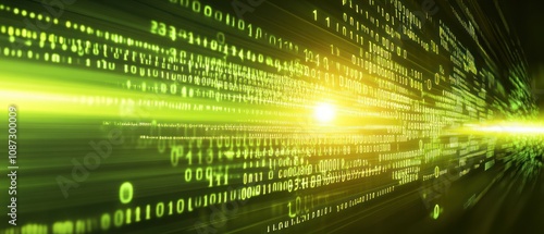 Abstract digital background with glowing binary codes and light rays.