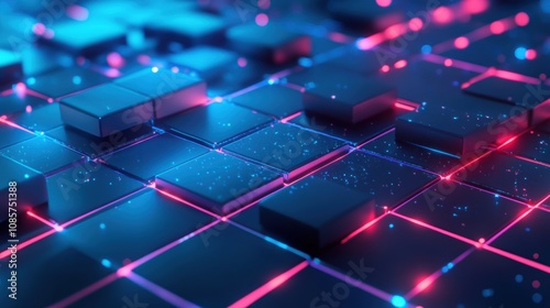 Abstract digital background with luminous squares and neon lines in vibrant blue and pink tones, creating a futuristic and dynamic atmosphere for creative projects.
