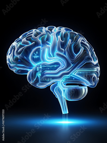 Abstract digital brain with glowing blue circuits and data streams on a dark background, representing artificial intelligence and neural networks