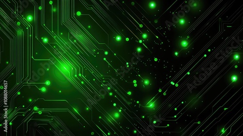 Abstract digital circuit board background with glowing green elements set against a dark backdrop, ideal for technology and innovation themes.