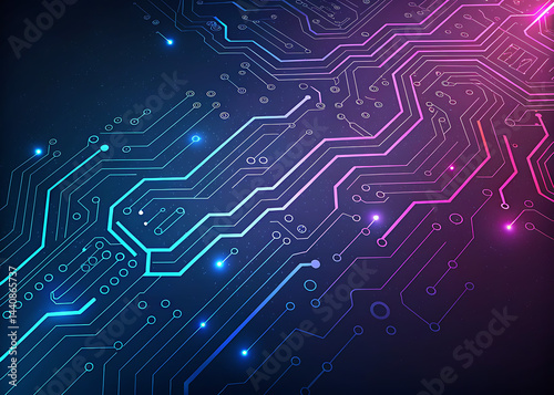 Abstract digital circuit board illuminated with glowing lines and lights.