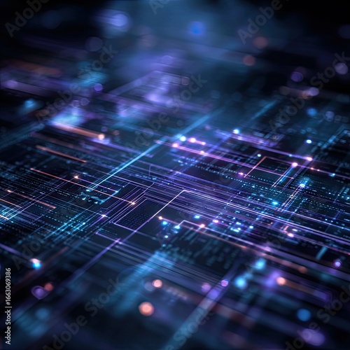 Abstract digital circuitry; glowing lines and nodes forming complex network